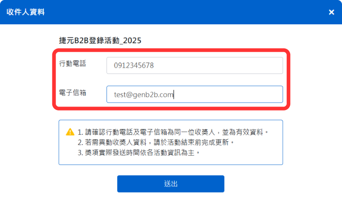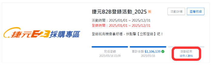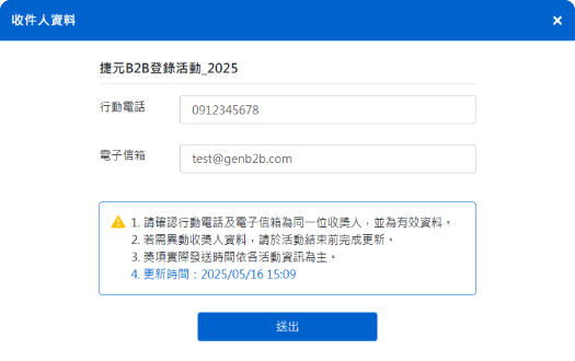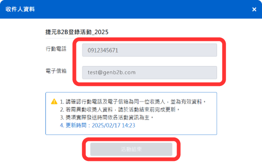超過活動時間僅可「檢視」收件人資料,如有修改收件資料需求,請與您的業務聯繫。
